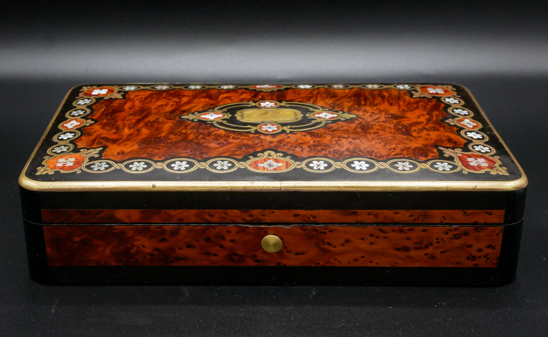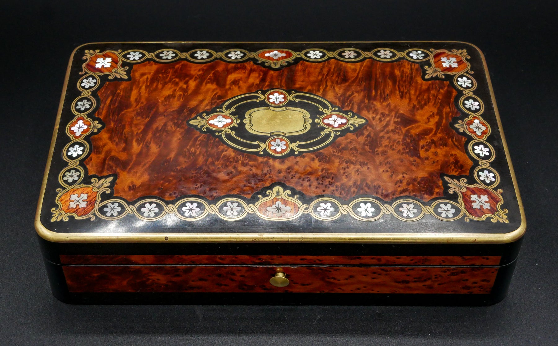 L’arme est vendue dans sa magnifique boîte à bijoux Napoléon III en marqueterie boulle époque XIXeme ornée de nacre, confectionnée sur-mesure pour accueillir au mieux et honorer cette pièce de la plus belle des manières. Ce coffret est dans un état de conservation remarquable.